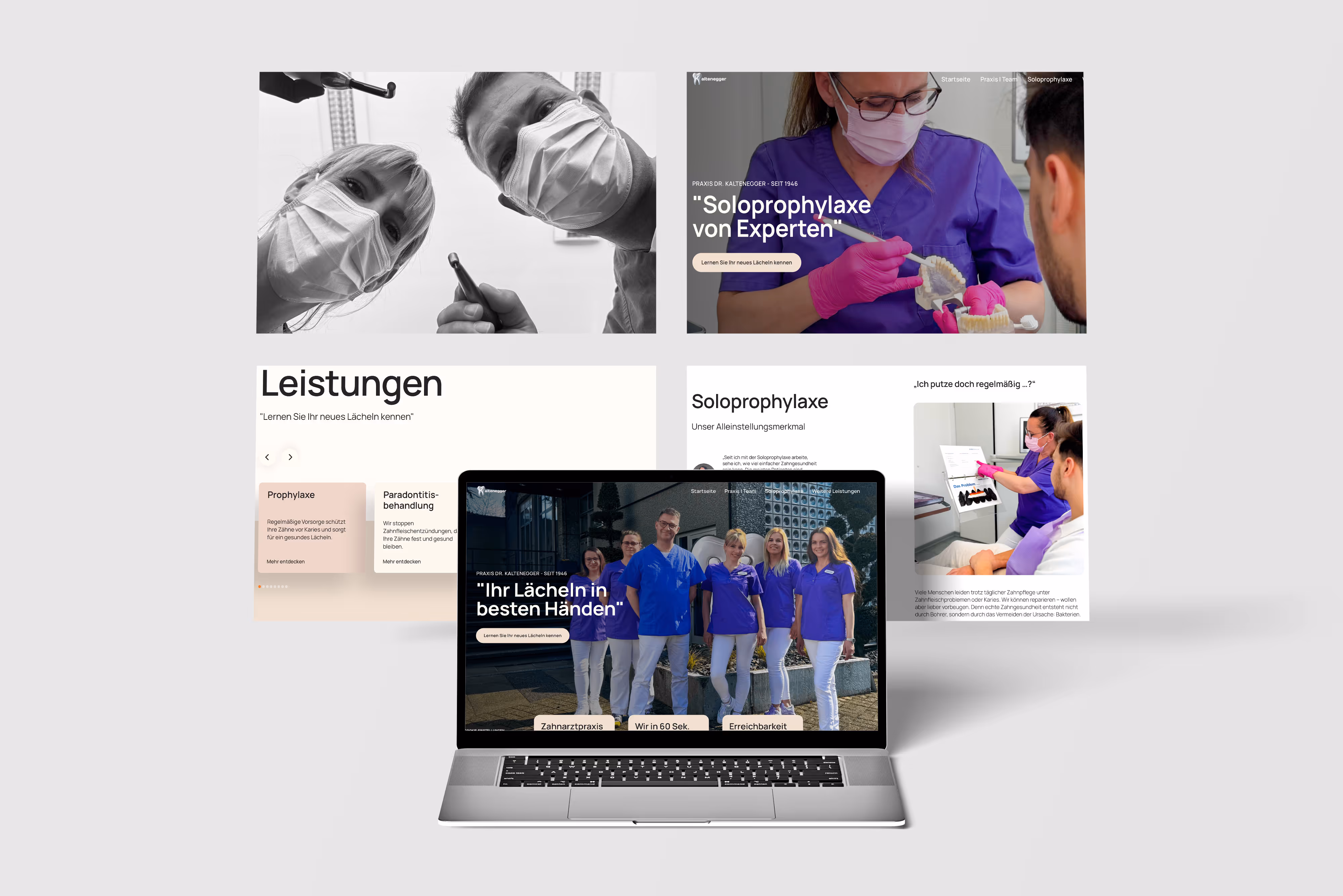 Unsere Lösung war eine Website, die zeigt, was die Praxis ausmacht: Nähe zum Menschen,Kompetenz und mit der Soloprophylaxe ein Behandlungskonzept, das andere nicht haben. Statt langweiliger Zahnarzt-Ästhetik haben wir eine warme, einladende Präsenz geschaffen. Die Bilder zeigen das Team, die Texte sprechen die Sprache der Patienten, und die Soloprophylaxe wird so erklärt, dass jeder versteht, warum sie wichtig ist.